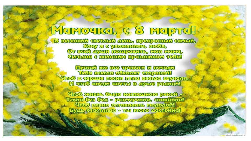 Милая мамочка, в этот чудесный весенний день позволь мне выразить всю любовь, всё мое тепло, все чувства к тебе. Порой, за суетой и в круговороте дней, мы забываем о самом ценном — о родителях. Но в моей душе навсегда поселился твой прекрасный образ: я всю жизнь буду помнить прикосновения твоих ласковых рук и твой родной голос, что напевал мне в детстве тихие колыбельные. Мама, в этот чудесный день 8 Марта хочу пожелать тебе радости, чтоб твои чудесные глаза сияли только от счастья. Добра, пусть оно заполнит каждую клеточку души и поселится в твоем огромном материнском сердце. Женского счастья тебе, ведь ты его заслуживаешь. С праздником, родная моя!