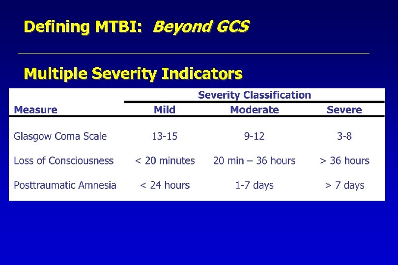 Defining MTBI: Beyond GCS Multiple Severity Indicators