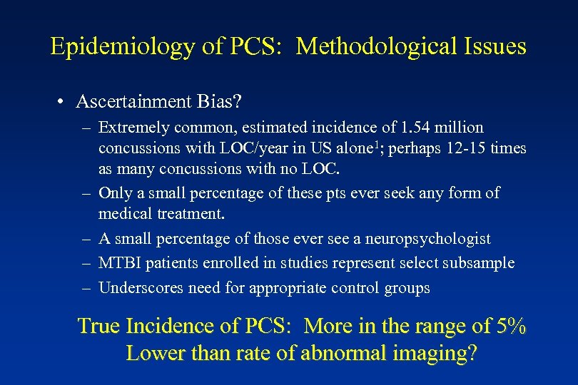 Epidemiology of PCS: Methodological Issues • Ascertainment Bias? – Extremely common, estimated incidence of 1. 54 million concussions with LOC/year in US alone 1; perhaps 12 -15 times as many concussions with no LOC. – Only a small percentage of these pts ever seek any form of medical treatment. – A small percentage of those ever see a neuropsychologist – MTBI patients enrolled in studies represent select subsample – Underscores need for appropriate control groups True Incidence of PCS: More in the range of 5% Lower than rate of abnormal imaging?