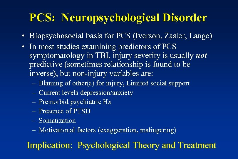 PCS: Neuropsychological Disorder • Biopsychosocial basis for PCS (Iverson, Zasler, Lange) • In most studies examining predictors of PCS symptomatology in TBI, injury severity is usually not predictive (sometimes relationship is found to be inverse), but non-injury variables are: – – – Blaming of other(s) for injury, Limited social support Current levels depression/anxiety Premorbid psychiatric Hx Presence of PTSD Somatization Motivational factors (exaggeration, malingering) Implication: Psychological Theory and Treatment