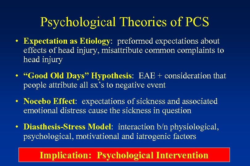 Psychological Theories of PCS • Expectation as Etiology: preformed expectations about effects of head injury, misattribute common complaints to head injury • “Good Old Days” Hypothesis: EAE + consideration that people attribute all sx’s to negative event • Nocebo Effect: expectations of sickness and associated emotional distress cause the sickness in question • Diasthesis-Stress Model: interaction b/n physiological, psychological, motivational and iatrogenic factors Implication: Psychological Intervention