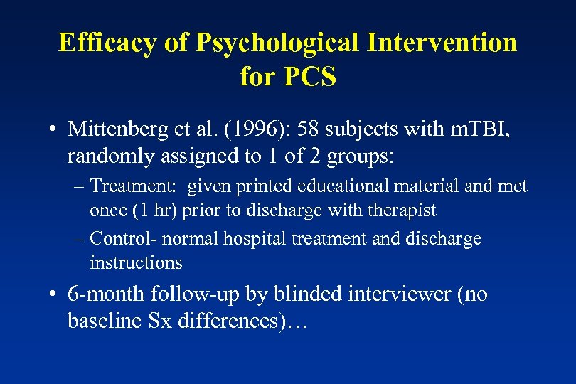 Efficacy of Psychological Intervention for PCS • Mittenberg et al. (1996): 58 subjects with m. TBI, randomly assigned to 1 of 2 groups: – Treatment: given printed educational material and met once (1 hr) prior to discharge with therapist – Control- normal hospital treatment and discharge instructions • 6 -month follow-up by blinded interviewer (no baseline Sx differences)…