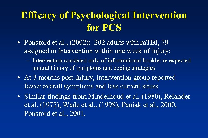 Efficacy of Psychological Intervention for PCS • Ponsford et al. , (2002): 202 adults with m. TBI, 79 assigned to intervention within one week of injury: – Intervention consisted only of informational booklet re expected natural history of symptoms and coping strategies • At 3 months post-injury, intervention group reported fewer overall symptoms and less current stress • Similar findings from Minderhoud et al. (1980), Relander et al. (1972), Wade et al. , (1998), Paniak et al. , 2000, Ponsford et al. , 2001.