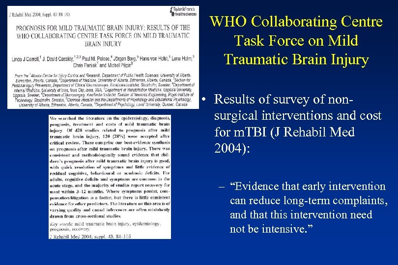WHO Collaborating Centre Task Force on Mild Traumatic Brain Injury • Results of survey of nonsurgical interventions and cost for m. TBI (J Rehabil Med 2004): – “Evidence that early intervention can reduce long-term complaints, and that this intervention need not be intensive. ”