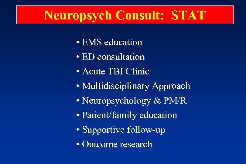Neuropsych Consult: STAT • EMS education • ED consultation • Acute TBI Clinic • Multidisciplinary Approach • Neuropsychology & PM/R • Patient/family education • Supportive follow-up • Outcome research