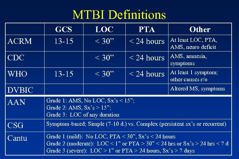 MTBI Definitions ACRM GCS 13 -15 WHO DVBIC AAN 13 -15 PTA < 24 hours < 30” CDC LOC < 30” Other < 24 hours AMS, amnesia, symptoms < 30” < 24 hours At least 1 symptom; other causes r/o At least LOC, PTA, AMS, neuro deficit Altered MS, symptoms Grade 1: AMS, No LOC, Sx’s < 15”; Grade 2: AMS, Sx’s > 15”; Grade 3: LOC of any duration CSG Symptom-based; Simple (7 -10 d. ) vs. Complex (persistent sx’s or recurrent) Cantu Grade 1 (mild): No LOC, PTA < 30”, Sx’s < 24 hours Grade 2 (moderate): LOC < 1” or PTA > 30” < 24 hrs or Sx’s > 24 hrs < 7 d Grade 3 (severe): LOC > 1” or PTA > 24 hours, Sx’s > 7 days