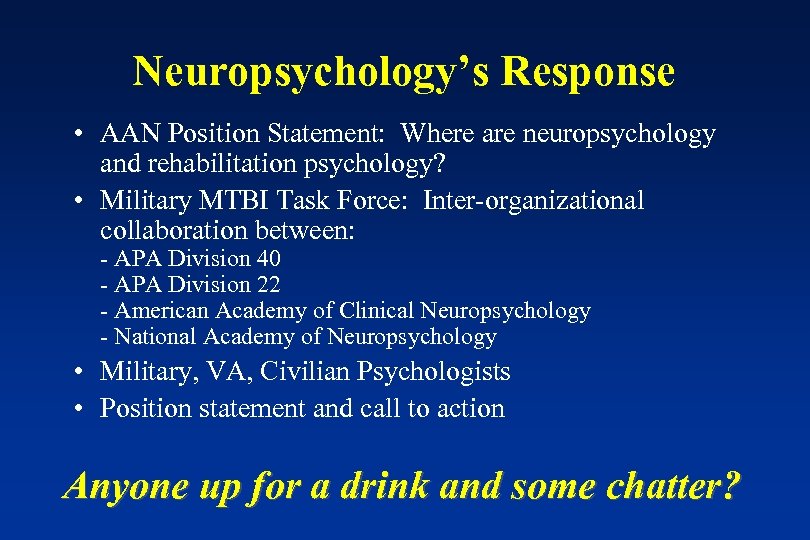 Neuropsychology’s Response • AAN Position Statement: Where are neuropsychology and rehabilitation psychology? • Military MTBI Task Force: Inter-organizational collaboration between: - APA Division 40 - APA Division 22 - American Academy of Clinical Neuropsychology - National Academy of Neuropsychology • Military, VA, Civilian Psychologists • Position statement and call to action Anyone up for a drink and some chatter?