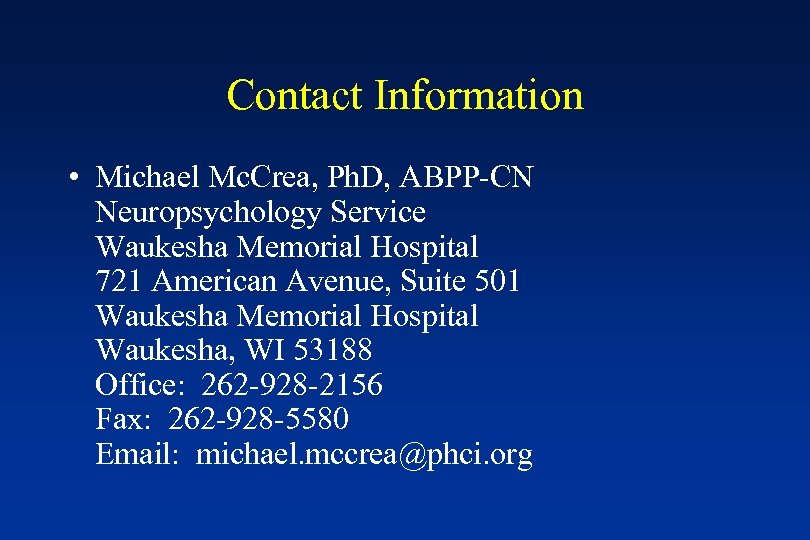 Contact Information • Michael Mc. Crea, Ph. D, ABPP-CN Neuropsychology Service Waukesha Memorial Hospital 721 American Avenue, Suite 501 Waukesha Memorial Hospital Waukesha, WI 53188 Office: 262 -928 -2156 Fax: 262 -928 -5580 Email: michael. mccrea@phci. org