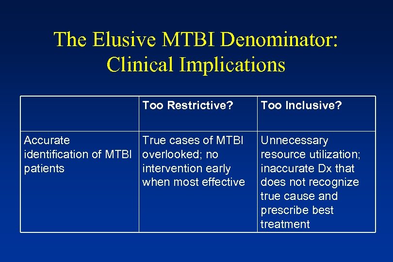 The Elusive MTBI Denominator: Clinical Implications Too Restrictive? Accurate True cases of MTBI identification of MTBI overlooked; no patients intervention early when most effective Too Inclusive? Unnecessary resource utilization; inaccurate Dx that does not recognize true cause and prescribe best treatment