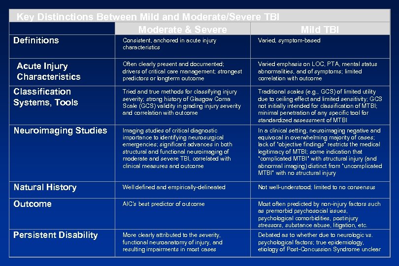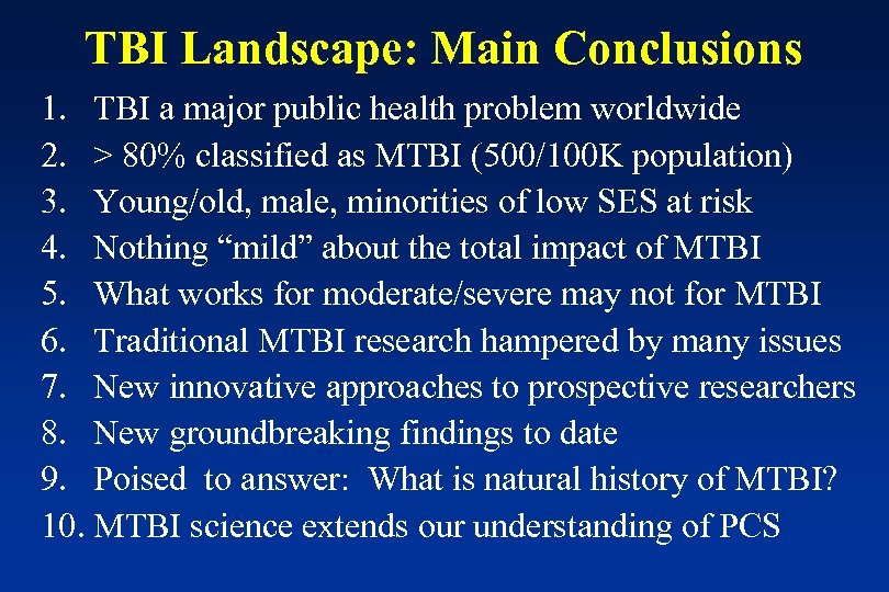 TBI Landscape: Main Conclusions 1. TBI a major public health problem worldwide 2. > 80% classified as MTBI (500/100 K population) 3. Young/old, male, minorities of low SES at risk 4. Nothing “mild” about the total impact of MTBI 5. What works for moderate/severe may not for MTBI 6. Traditional MTBI research hampered by many issues 7. New innovative approaches to prospective researchers 8. New groundbreaking findings to date 9. Poised to answer: What is natural history of MTBI? 10. MTBI science extends our understanding of PCS