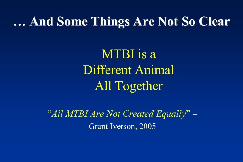 … And Some Things Are Not So Clear MTBI is a Different Animal All Together “All MTBI Are Not Created Equally” – Grant Iverson, 2005