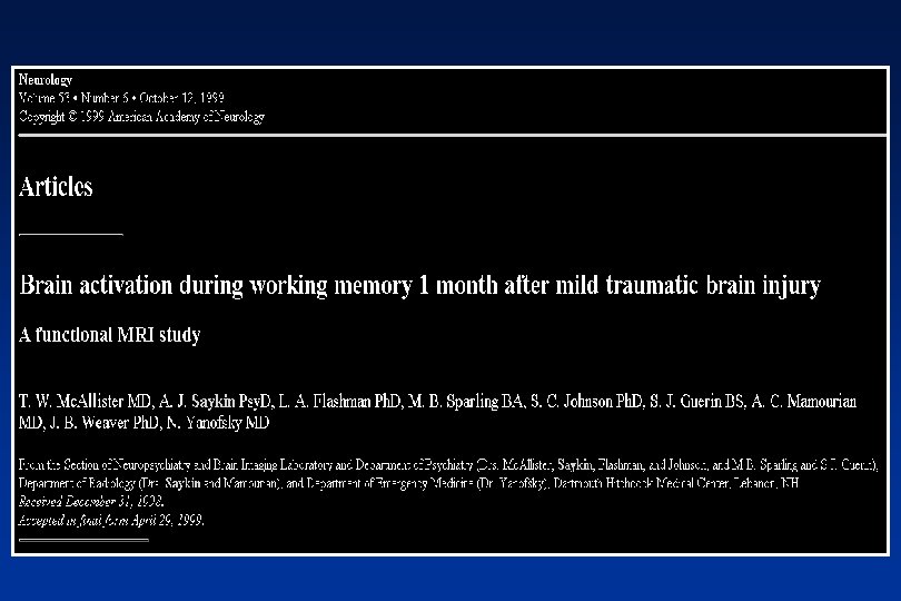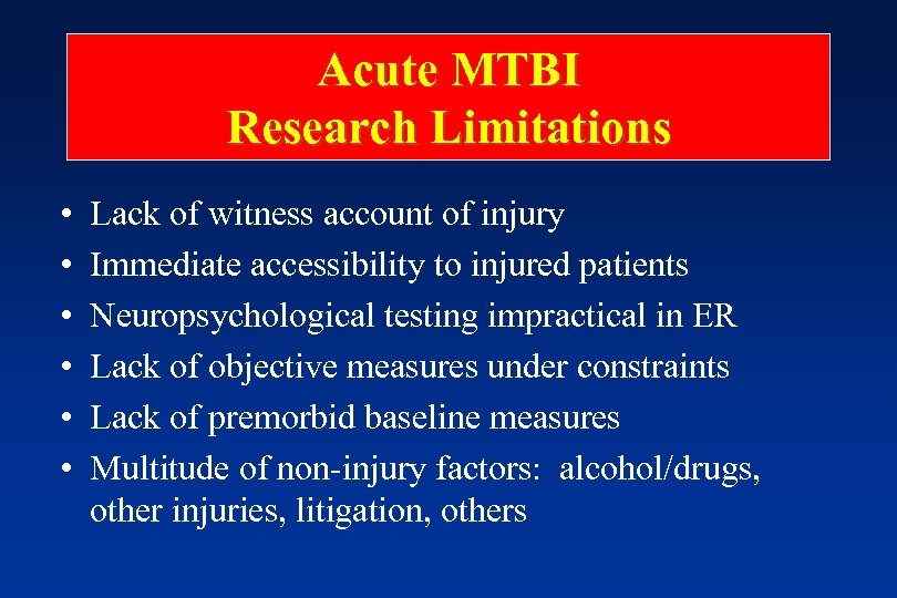 Acute MTBI Research Limitations • • • Lack of witness account of injury Immediate accessibility to injured patients Neuropsychological testing impractical in ER Lack of objective measures under constraints Lack of premorbid baseline measures Multitude of non-injury factors: alcohol/drugs, other injuries, litigation, others