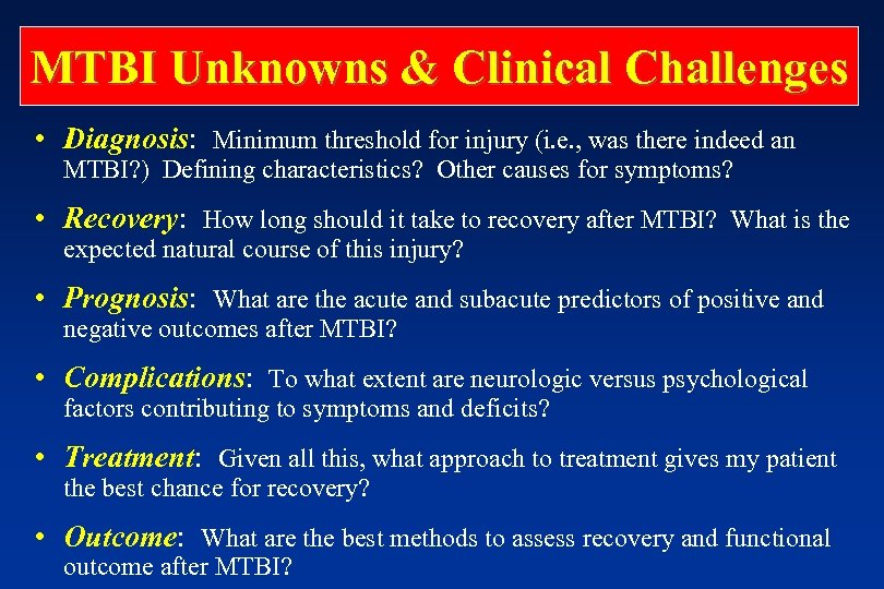 MTBI Unknowns & Clinical Challenges • Diagnosis: Minimum threshold for injury (i. e. , was there indeed an MTBI? ) Defining characteristics? Other causes for symptoms? • Recovery: How long should it take to recovery after MTBI? What is the expected natural course of this injury? • Prognosis: What are the acute and subacute predictors of positive and negative outcomes after MTBI? • Complications: To what extent are neurologic versus psychological factors contributing to symptoms and deficits? • Treatment: Given all this, what approach to treatment gives my patient the best chance for recovery? • Outcome: What are the best methods to assess recovery and functional outcome after MTBI?