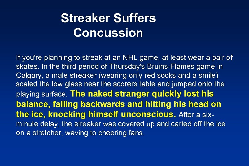 Streaker Suffers Concussion If you're planning to streak at an NHL game, at least wear a pair of skates. In the third period of Thursday's Bruins-Flames game in Calgary, a male streaker (wearing only red socks and a smile) scaled the low glass near the scorers table and jumped onto the playing surface. The naked stranger quickly lost his balance, falling backwards and hitting his head on the ice, knocking himself unconscious. After a sixminute delay, the streaker was covered up and carted off the ice on a stretcher, waving to cheering fans.
