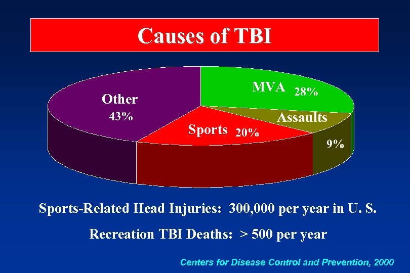 Causes of TBI MVA Other Sports Assaults Sports-Related Head Injuries: 300, 000 per year in U. S. Recreation TBI Deaths: > 500 per year Centers for Disease Control and Prevention, 2000
