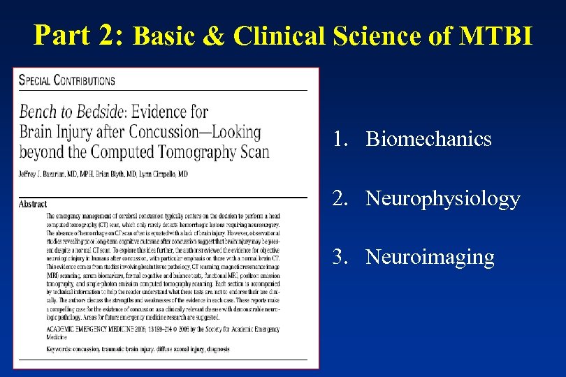 Part 2: Basic & Clinical Science of MTBI 1. Biomechanics 2. Neurophysiology 3. Neuroimaging