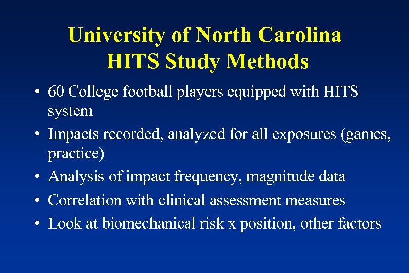 University of North Carolina HITS Study Methods • 60 College football players equipped with HITS system • Impacts recorded, analyzed for all exposures (games, practice) • Analysis of impact frequency, magnitude data • Correlation with clinical assessment measures • Look at biomechanical risk x position, other factors