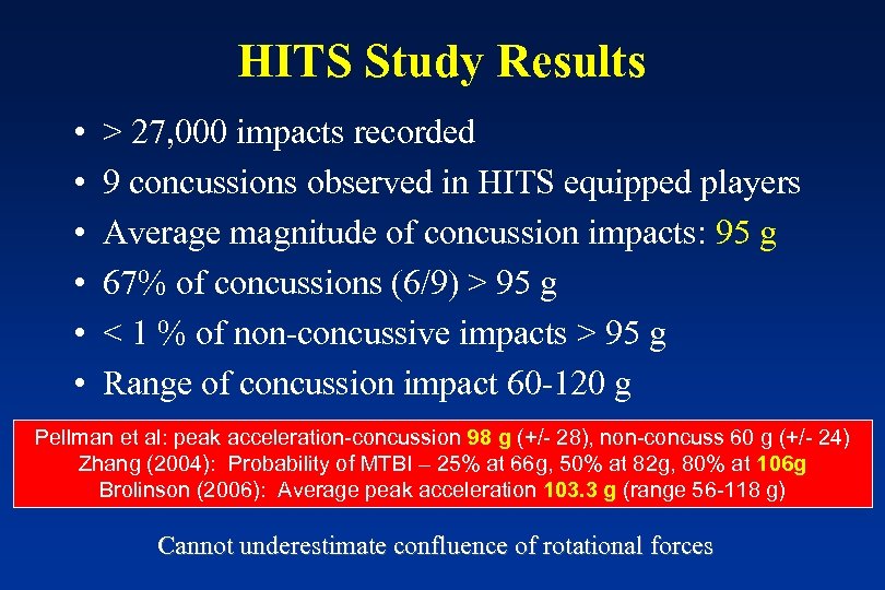 HITS Study Results • • • > 27, 000 impacts recorded 9 concussions observed in HITS equipped players Average magnitude of concussion impacts: 95 g 67% of concussions (6/9) > 95 g < 1 % of non-concussive impacts > 95 g Range of concussion impact 60 -120 g Pellman et al: peak acceleration-concussion 98 g (+/- 28), non-concuss 60 g (+/- 24) Zhang (2004): Probability of MTBI – 25% at 66 g, 50% at 82 g, 80% at 106 g Brolinson (2006): Average peak acceleration 103. 3 g (range 56 -118 g) Cannot underestimate confluence of rotational forces