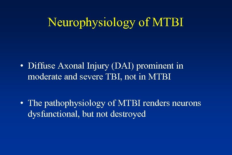 Neurophysiology of MTBI • Diffuse Axonal Injury (DAI) prominent in moderate and severe TBI, not in MTBI • The pathophysiology of MTBI renders neurons dysfunctional, but not destroyed