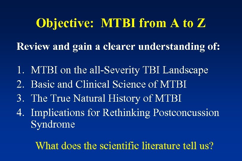 Objective: MTBI from A to Z Review and gain a clearer understanding of: 1. 2. 3. 4. MTBI on the all-Severity TBI Landscape Basic and Clinical Science of MTBI The True Natural History of MTBI Implications for Rethinking Postconcussion Syndrome What does the scientific literature tell us?