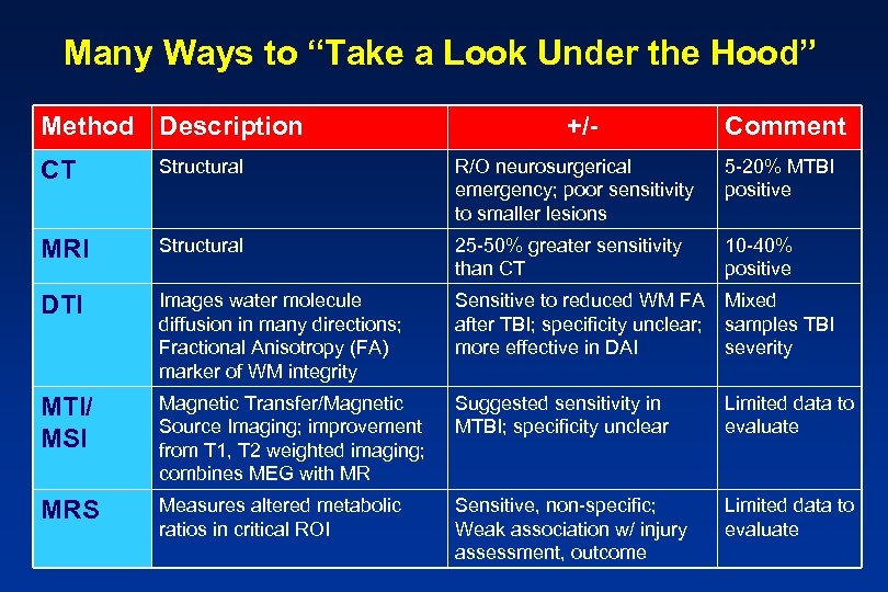 Many Ways to “Take a Look Under the Hood” Method Description +/- Comment CT Structural R/O neurosurgerical emergency; poor sensitivity to smaller lesions 5 -20% MTBI positive MRI Structural 25 -50% greater sensitivity than CT 10 -40% positive DTI Images water molecule diffusion in many directions; Fractional Anisotropy (FA) marker of WM integrity Sensitive to reduced WM FA Mixed after TBI; specificity unclear; samples TBI more effective in DAI severity MTI/ MSI Magnetic Transfer/Magnetic Source Imaging; improvement from T 1, T 2 weighted imaging; combines MEG with MR Suggested sensitivity in MTBI; specificity unclear Limited data to evaluate MRS Measures altered metabolic ratios in critical ROI Sensitive, non-specific; Weak association w/ injury assessment, outcome Limited data to evaluate