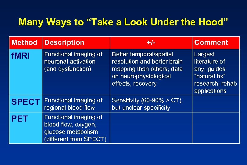 Many Ways to “Take a Look Under the Hood” Method Description +/- f. MRI Functional imaging of neuronal activation (and dysfunction) Better temporal/spatial resolution and better brain mapping than others; data on neurophysiological effects, recovery SPECT Functional imaging of regional blood flow Sensitivity (60 -90% > CT), but unclear specificity PET Functional imaging of blood flow, oxygen, glucose metabolism (different from SPECT) Comment Largest literature of any; guides “natural hx” research; rehab applications
