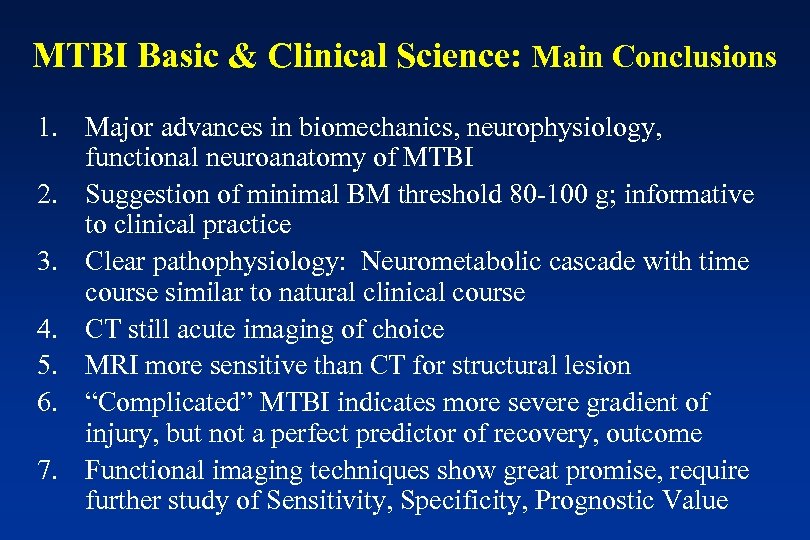 MTBI Basic & Clinical Science: Main Conclusions 1. Major advances in biomechanics, neurophysiology, functional neuroanatomy of MTBI 2. Suggestion of minimal BM threshold 80 -100 g; informative to clinical practice 3. Clear pathophysiology: Neurometabolic cascade with time course similar to natural clinical course 4. CT still acute imaging of choice 5. MRI more sensitive than CT for structural lesion 6. “Complicated” MTBI indicates more severe gradient of injury, but not a perfect predictor of recovery, outcome 7. Functional imaging techniques show great promise, require further study of Sensitivity, Specificity, Prognostic Value