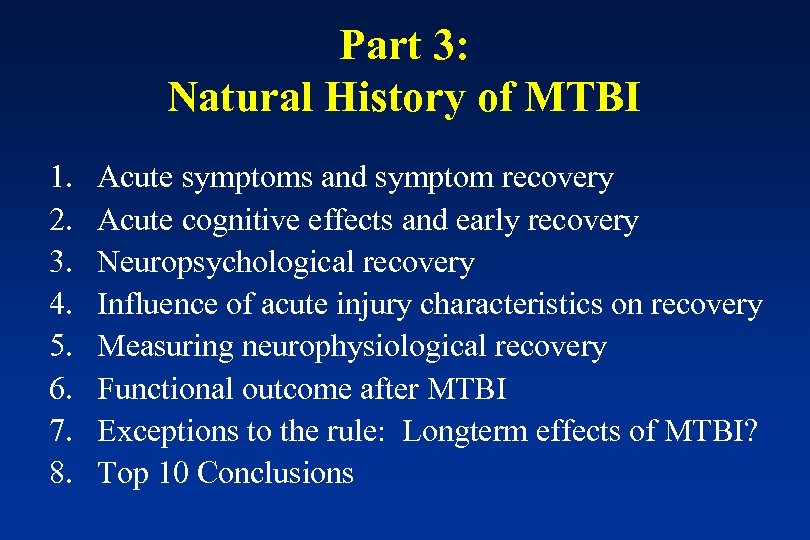 Part 3: Natural History of MTBI 1. 2. 3. 4. 5. 6. 7. 8. Acute symptoms and symptom recovery Acute cognitive effects and early recovery Neuropsychological recovery Influence of acute injury characteristics on recovery Measuring neurophysiological recovery Functional outcome after MTBI Exceptions to the rule: Longterm effects of MTBI? Top 10 Conclusions