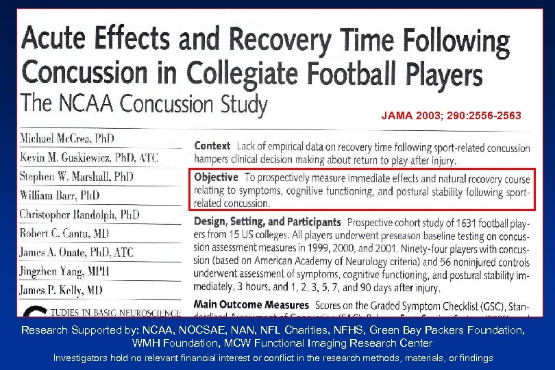 JAMA 2003; 290: 2556 -2563 Research Supported by: NCAA, NOCSAE, NAN, NFL Charities, NFHS, Green Bay Packers Foundation, WMH Foundation, MCW Functional Imaging Research Center Investigators hold no relevant financial interest or conflict in the research methods, materials, or findings