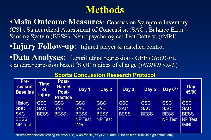 Methods • Main Outcome Measures: Concussion Symptom Inventory (CSI), Standardized Assessment of Concussion (SAC), Balance Error Scoring System (BESS), Neuropsychological Test Battery, (f. MRI) • Injury Follow-up: Injured player & matched control • Data Analyses: Longitudinal regression - GEE (GROUP), standard regression based (SRB) indices of change (INDIVIDUAL)