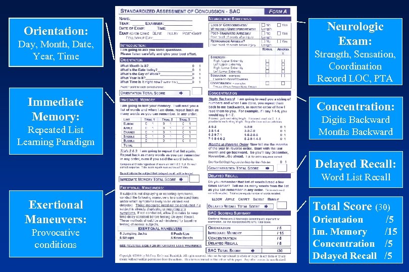 Orientation: Day, Month, Date, Year, Time Immediate Memory: Repeated List Learning Paradigm Neurologic Exam: Strength, Sensation, Coordination Record LOC, PTA Concentration: Digits Backward Months Backward Delayed Recall: Word List Recall Exertional Maneuvers: Provocative conditions Total Score (30) Orientation Im. Memory Concentration Delayed Recall /5 /15 /5 /5