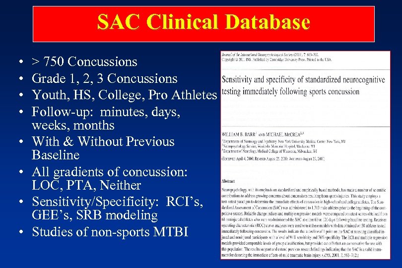 SAC Clinical Database • • > 750 Concussions Grade 1, 2, 3 Concussions Youth, HS, College, Pro Athletes Follow-up: minutes, days, weeks, months With & Without Previous Baseline All gradients of concussion: LOC, PTA, Neither Sensitivity/Specificity: RCI’s, GEE’s, SRB modeling Studies of non-sports MTBI
