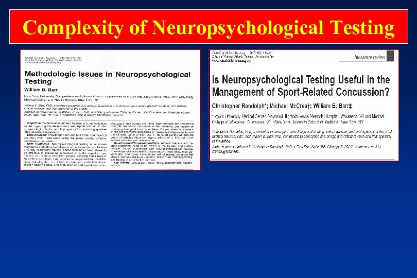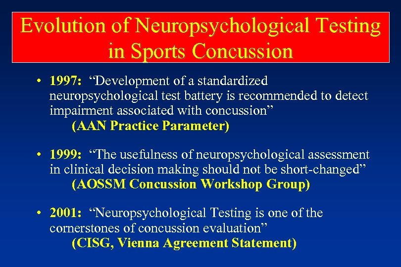 Evolution of Neuropsychological Testing in Sports Concussion • 1997: “Development of a standardized neuropsychological test battery is recommended to detect impairment associated with concussion” (AAN Practice Parameter) • 1999: “The usefulness of neuropsychological assessment in clinical decision making should not be short-changed” (AOSSM Concussion Workshop Group) • 2001: “Neuropsychological Testing is one of the cornerstones of concussion evaluation” (CISG, Vienna Agreement Statement)