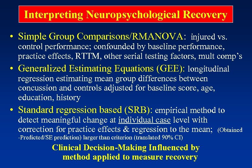Interpreting Neuropsychological Recovery • Simple Group Comparisons/RMANOVA: injured vs. control performance; confounded by baseline performance, practice effects, RTTM, other serial testing factors, mult comp’s • Generalized Estimating Equations (GEE): longitudinal regression estimating mean group differences between concussion and controls adjusted for baseline score, age, education, history • Standard regression based (SRB): empirical method to detect meaningful change at individual case level with correction for practice effects & regression to the mean; (Obtained -Predicted/SE prediction) larger than criterion (translated 90% CI) Clinical Decision-Making Influenced by method applied to measure recovery
