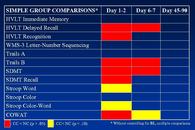 SIMPLE GROUP COMPARISONS* HVLT Immediate Memory HVLT Delayed Recall HVLT Recognition Day 1 -2 Day 6 -7 Day 45 -90 WMS-3 Letter-Number Sequencing Trails A Trails B SDMT Recall Stroop Word Stroop Color-Word COWAT : CC < NC (p >. 05) : CC< NC (p <. 10) * Without controlling for BL, multiple comparisons
