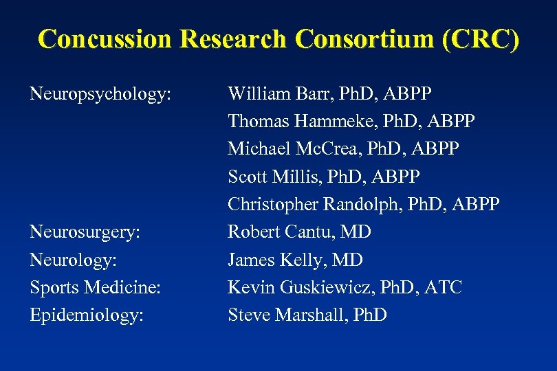 Concussion Research Consortium (CRC) Neuropsychology: Neurosurgery: Neurology: Sports Medicine: Epidemiology: William Barr, Ph. D, ABPP Thomas Hammeke, Ph. D, ABPP Michael Mc. Crea, Ph. D, ABPP Scott Millis, Ph. D, ABPP Christopher Randolph, Ph. D, ABPP Robert Cantu, MD James Kelly, MD Kevin Guskiewicz, Ph. D, ATC Steve Marshall, Ph. D