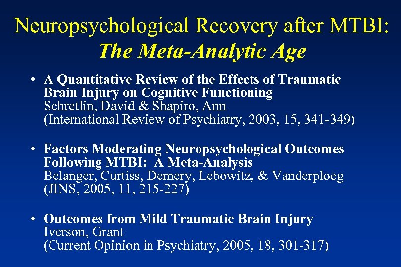 Neuropsychological Recovery after MTBI: The Meta-Analytic Age • A Quantitative Review of the Effects of Traumatic Brain Injury on Cognitive Functioning Schretlin, David & Shapiro, Ann (International Review of Psychiatry, 2003, 15, 341 -349) • Factors Moderating Neuropsychological Outcomes Following MTBI: A Meta-Analysis Belanger, Curtiss, Demery, Lebowitz, & Vanderploeg (JINS, 2005, 11, 215 -227) • Outcomes from Mild Traumatic Brain Injury Iverson, Grant (Current Opinion in Psychiatry, 2005, 18, 301 -317)
