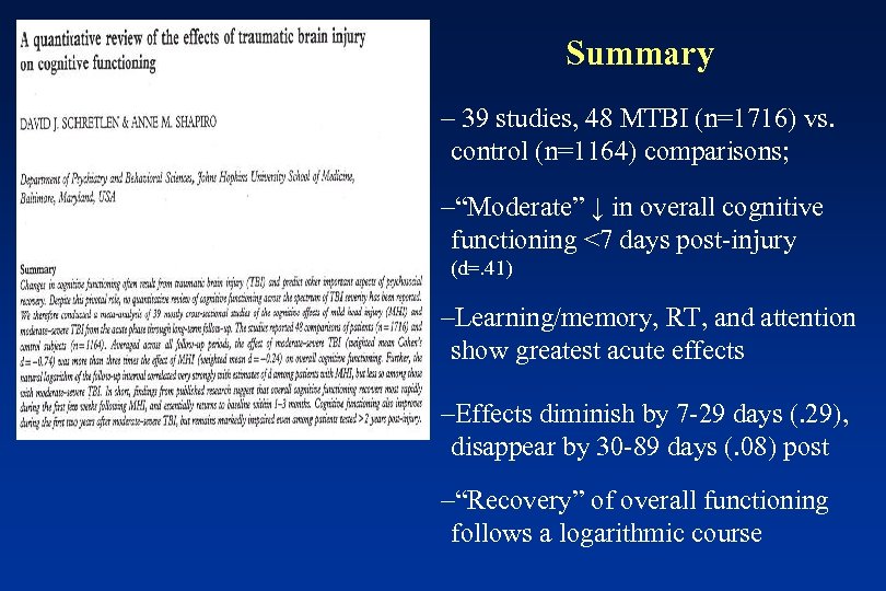Summary – 39 studies, 48 MTBI (n=1716) vs. control (n=1164) comparisons; –“Moderate” ↓ in overall cognitive functioning <7 days post-injury (d=. 41) –Learning/memory, RT, and attention show greatest acute effects –Effects diminish by 7 -29 days (. 29), disappear by 30 -89 days (. 08) post –“Recovery” of overall functioning follows a logarithmic course