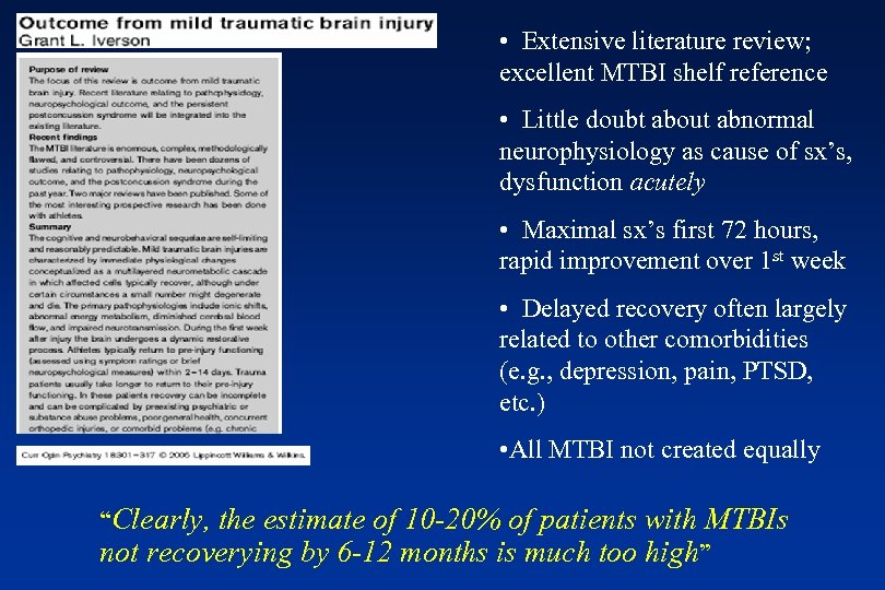• Extensive literature review; excellent MTBI shelf reference • Little doubt about abnormal neurophysiology as cause of sx’s, dysfunction acutely • Maximal sx’s first 72 hours, rapid improvement over 1 st week • Delayed recovery often largely related to other comorbidities (e. g. , depression, pain, PTSD, etc. ) • All MTBI not created equally “Clearly, the estimate of 10 -20% of patients with MTBIs not recoverying by 6 -12 months is much too high”