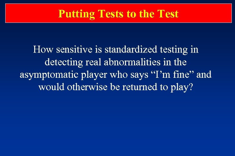 Putting Tests to the Test How sensitive is standardized testing in detecting real abnormalities in the asymptomatic player who says “I’m fine” and would otherwise be returned to play?