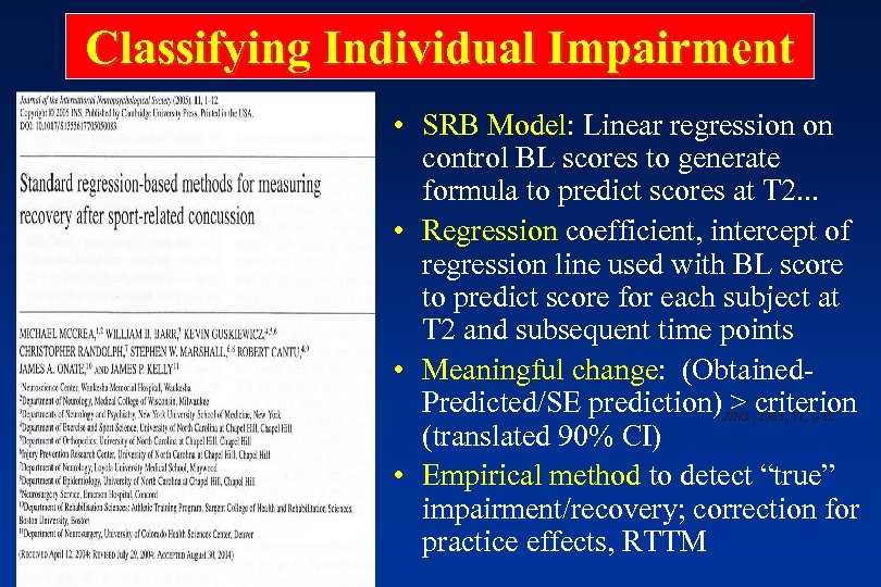 Classifying Individual Impairment • SRB Model: Linear regression on control BL scores to generate formula to predict scores at T 2. . . • Regression coefficient, intercept of regression line used with BL score to predict score for each subject at T 2 and subsequent time points • Meaningful change: (Obtained. Predicted/SE prediction) > criterion JINS , 2005, 11, 1 -12 (translated 90% CI) • Empirical method to detect “true” impairment/recovery; correction for practice effects, RTTM