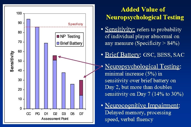 Added Value of Neuropsychological Testing Specificity • Sensitivity: refers to probability of individual player abnormal on any measure (Specificity > 84%) • Brief Battery: GSC, BESS, SAC • Neuropsychological Testing: minimal increase (5%) in sensitivity over brief battery on Day 2, but more than doubles sensitivity on Day 7 (14% to 30%) • Neurocognitive Impairment: Delayed memory, processing speed, verbal fluency