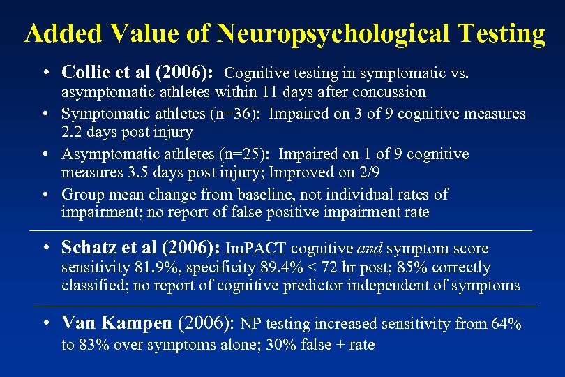 Added Value of Neuropsychological Testing • Collie et al (2006): Cognitive testing in symptomatic vs. asymptomatic athletes within 11 days after concussion • Symptomatic athletes (n=36): Impaired on 3 of 9 cognitive measures 2. 2 days post injury • Asymptomatic athletes (n=25): Impaired on 1 of 9 cognitive measures 3. 5 days post injury; Improved on 2/9 • Group mean change from baseline, not individual rates of impairment; no report of false positive impairment rate • Schatz et al (2006): Im. PACT cognitive and symptom score sensitivity 81. 9%, specificity 89. 4% < 72 hr post; 85% correctly classified; no report of cognitive predictor independent of symptoms • Van Kampen (2006): NP testing increased sensitivity from 64% to 83% over symptoms alone; 30% false + rate