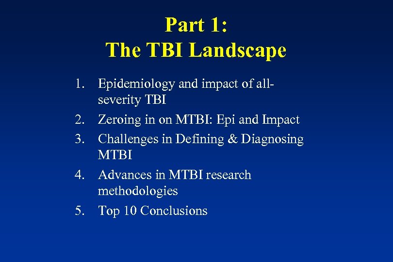 Part 1: The TBI Landscape 1. Epidemiology and impact of allseverity TBI 2. Zeroing in on MTBI: Epi and Impact 3. Challenges in Defining & Diagnosing MTBI 4. Advances in MTBI research methodologies 5. Top 10 Conclusions