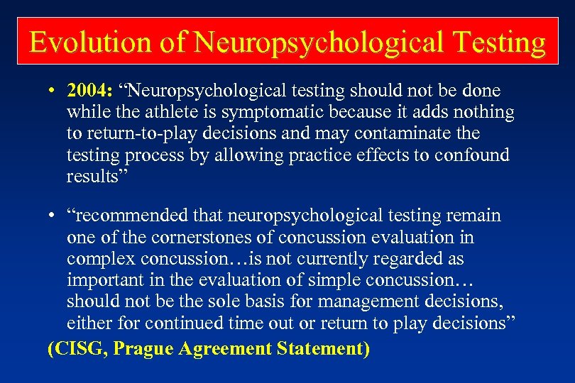 Evolution of Neuropsychological Testing • 2004: “Neuropsychological testing should not be done while the athlete is symptomatic because it adds nothing to return-to-play decisions and may contaminate the testing process by allowing practice effects to confound results” • “recommended that neuropsychological testing remain one of the cornerstones of concussion evaluation in complex concussion…is not currently regarded as important in the evaluation of simple concussion… should not be the sole basis for management decisions, either for continued time out or return to play decisions” (CISG, Prague Agreement Statement)