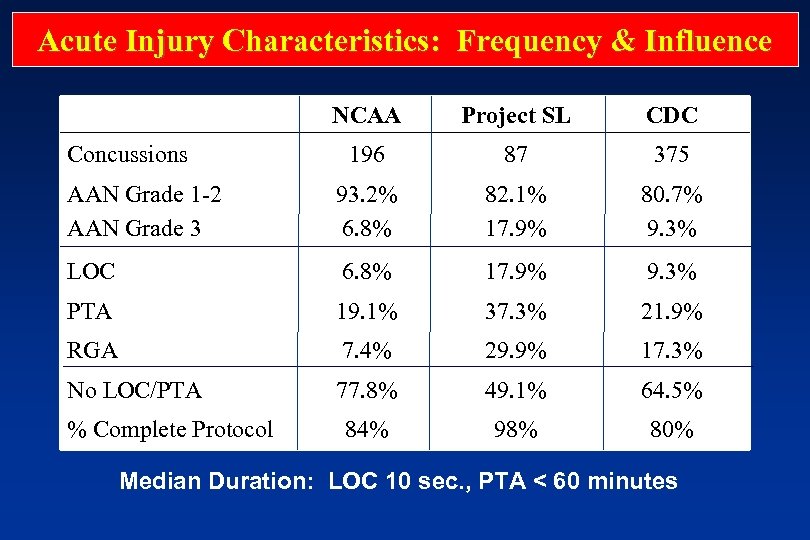 Acute Injury Characteristics: Frequency & Influence NCAA Project SL CDC 196 87 375 AAN Grade 1 -2 AAN Grade 3 93. 2% 6. 8% 82. 1% 17. 9% 80. 7% 9. 3% LOC 6. 8% 17. 9% 9. 3% PTA 19. 1% 37. 3% 21. 9% RGA 7. 4% 29. 9% 17. 3% No LOC/PTA 77. 8% 49. 1% 64. 5% 84% 98% 80% Concussions % Complete Protocol Median Duration: LOC 10 sec. , PTA < 60 minutes