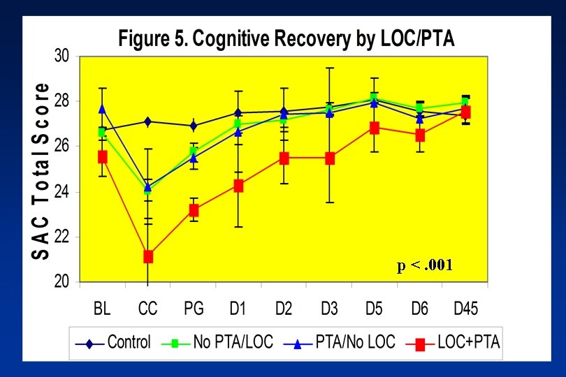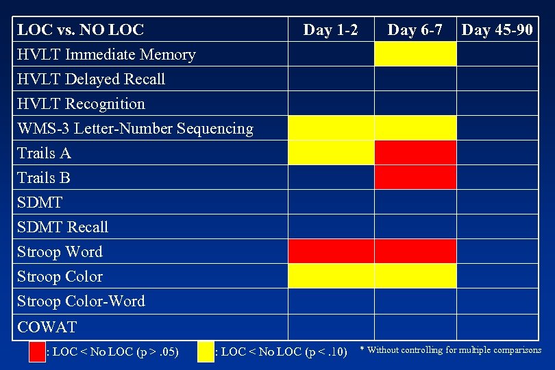 LOC vs. NO LOC HVLT Immediate Memory HVLT Delayed Recall HVLT Recognition Day 1 -2 Day 6 -7 Day 45 -90 WMS-3 Letter-Number Sequencing Trails A Trails B SDMT Recall Stroop Word Stroop Color-Word COWAT : LOC < No LOC (p >. 05) : LOC < No LOC (p <. 10) * Without controlling for multiple comparisons