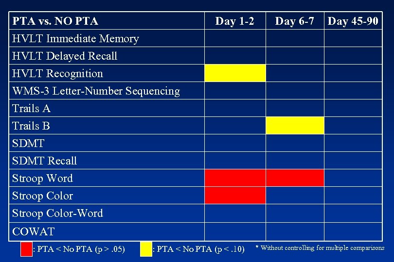 PTA vs. NO PTA HVLT Immediate Memory HVLT Delayed Recall HVLT Recognition Day 1 -2 Day 6 -7 Day 45 -90 WMS-3 Letter-Number Sequencing Trails A Trails B SDMT Recall Stroop Word Stroop Color-Word COWAT : PTA < No PTA (p >. 05) : PTA < No PTA (p <. 10) * Without controlling for multiple comparisons