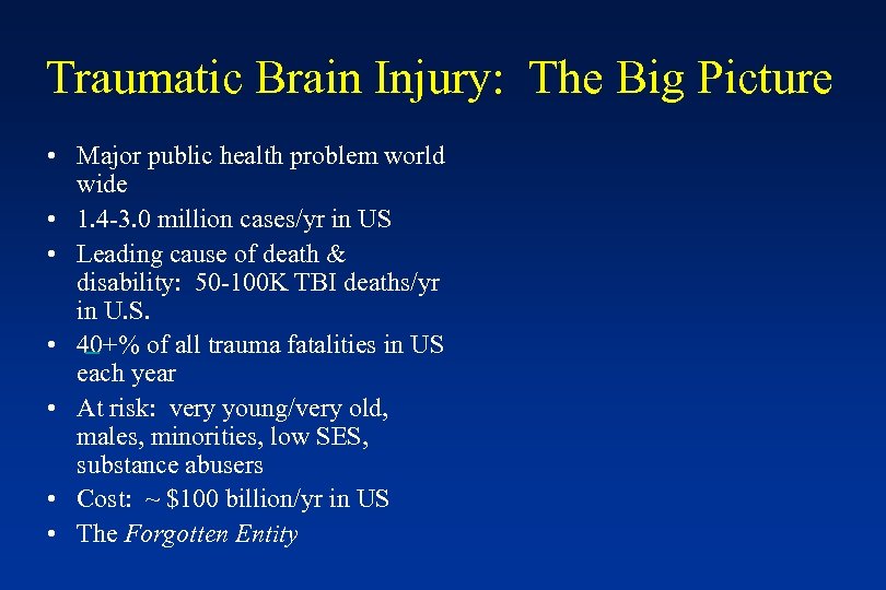 Traumatic Brain Injury: The Big Picture • Major public health problem world wide • 1. 4 -3. 0 million cases/yr in US • Leading cause of death & disability: 50 -100 K TBI deaths/yr in U. S. • 40+% of all trauma fatalities in US each year • At risk: very young/very old, males, minorities, low SES, substance abusers • Cost: ~ $100 billion/yr in US • The Forgotten Entity