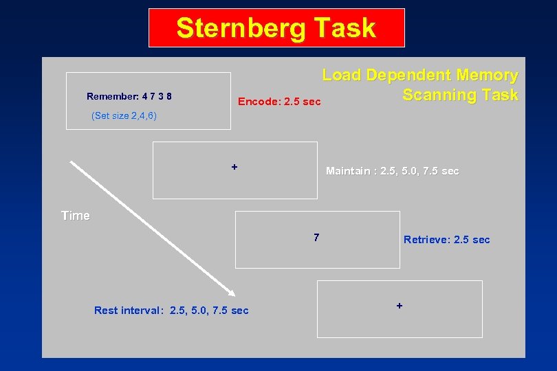 Sternberg Task Load Dependent Memory Scanning Task Encode: 2. 5 sec Remember: 4 7 3 8 (Set size 2, 4, 6) + Maintain : 2. 5, 5. 0, 7. 5 sec Time 7 Rest interval: 2. 5, 5. 0, 7. 5 sec Retrieve: 2. 5 sec +
